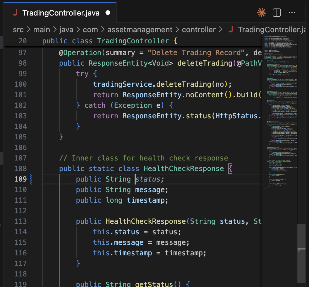 이제 예시로 TradingController.java 파일이 있다고 가정하고 이 파일을 열고 주석이나 코드를 작성합니다. Tab을 클릭하면 회색 텍스트로 코드가 자동 추천되고 Esc를 클릭하면 추천 코드가 취소된다면 된다면 성공입니다!