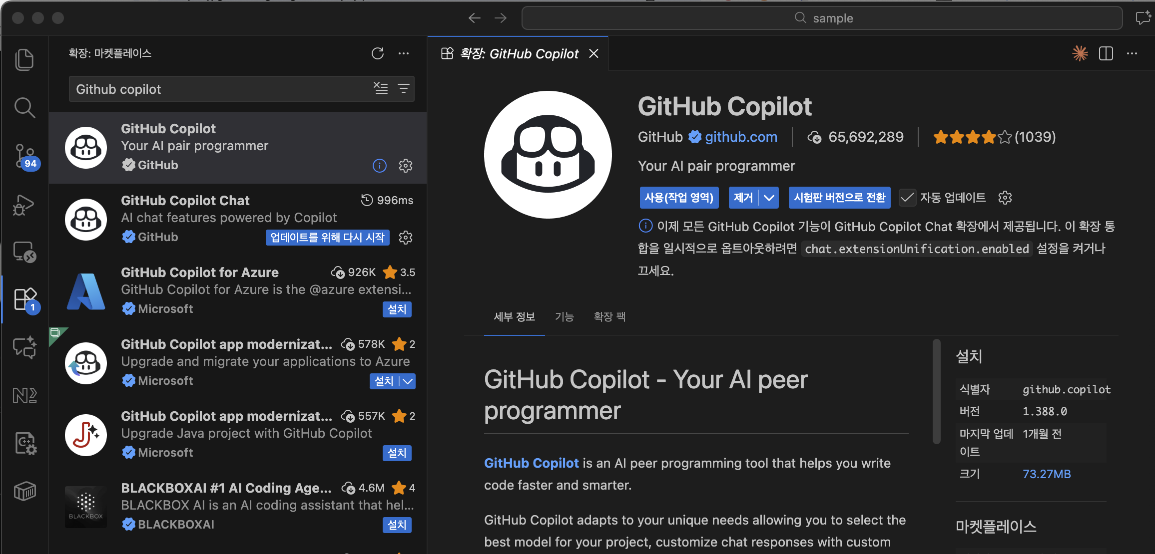 - 검색창에 GitHub Copilot을 입력합니다.